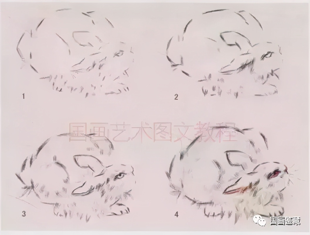 白兔耳朵画法:用中等兼毫笔,先用干淡墨从头部向外画轮廓,先画前耳,后画后耳,耳毛用虚笔轻轻扫过,速度稍快,最后用淡朱磦染耳内。