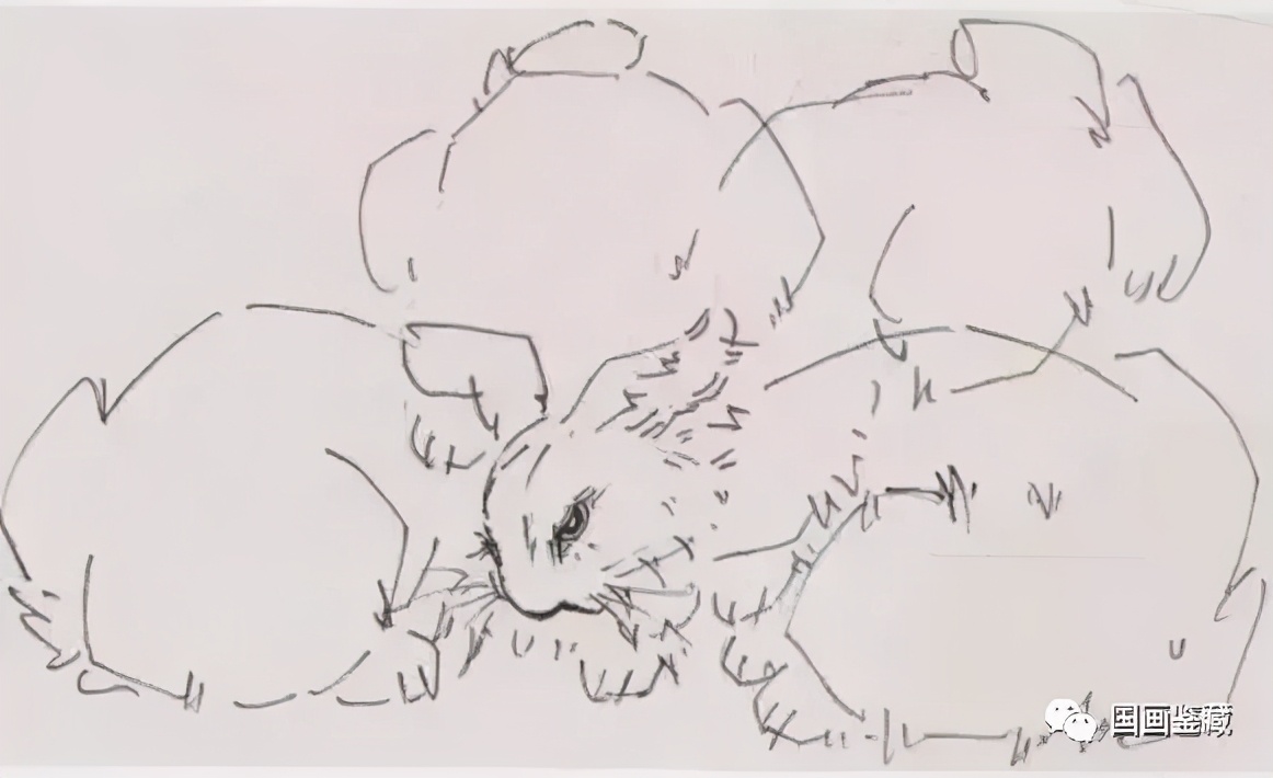 步骤三:淡墨干笔勾出兔身体其他部位、前后肢,按兔的结构散笔稍扫些绒毛。