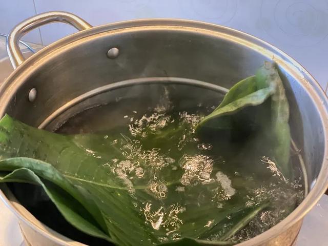 这是我们那特产的冬叶,和平时的粽叶一一样哦粽子是哪里的特产。冬叶洗干净,然后放开水里烫两三分钟,让它稍微有点儿变色,拿出来控下水。