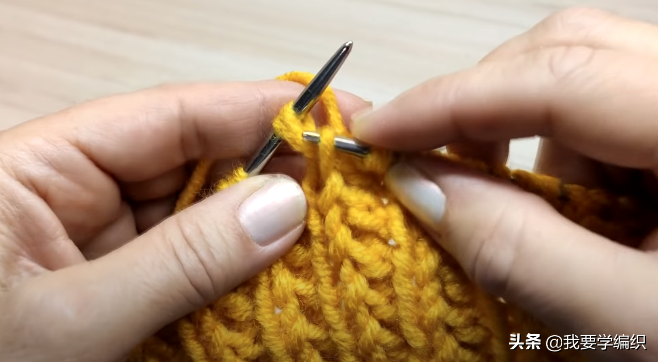 接着我们要开始织帽身部分。第1行:还是重复帽檐第1行的织法,前面部分正针这针是斜的,我们都是是直接穿入织1正,织到后面正针这针与下方的辫子基本处于垂直形态时,我们从这针开始,正针都要挑起下方一行的线圈,2针一起织正针左上2并1;第2行:挑1,重复(1反,1正)去织,最后1反;第3行:同第2行(即正织正,反织反)。