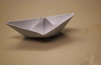 7.拉开上图中等腰边上的两条边,简易的小纸船就做好了。