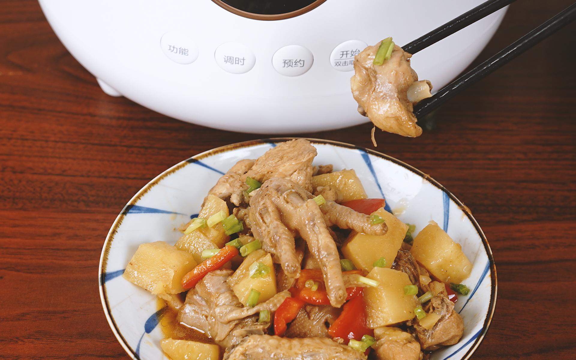 但现在新换的大宇电压力锅就彻底解决了类似这种吃不上饭的场景。奶爸的第一次下厨就用304不锈钢内胆来做一道鸡肉炖土豆。土豆切块,鸡腿划口入味,放入生姜,葱,料酒,蚝油,生抽一顿搅拌之后,使用“炖肉”模式只需要30分钟就能搞定。