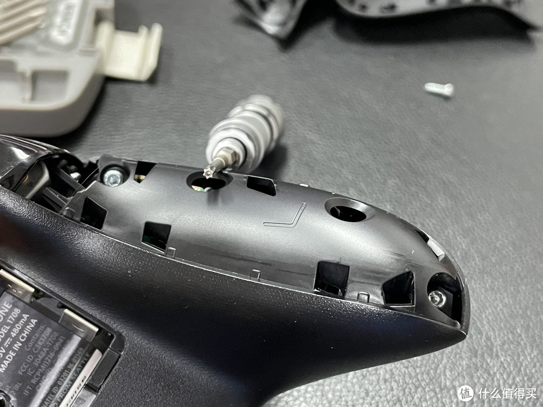 首先卸下来的是电池仓内被盖住的螺丝,这颗不是普通的六角螺丝,中心还有凸起,需要左上那种螺丝刀的才能正确拆开。